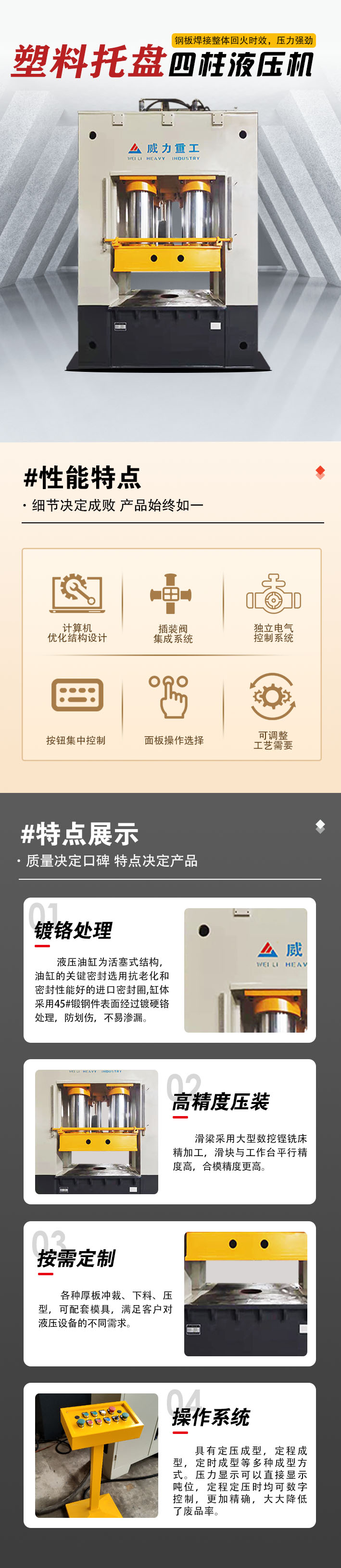 【產品描述】:塑料托盤成型液壓機是一種專門用于生產塑料托盤的設備。它采用液壓系統,通過將熔化的塑料注入模具中,然后施加高壓力進行成型,最終得到塑料托盤產品。這種機器具有高效、精準、穩定的特點,能夠生產出高質量的塑料托盤。 塑料托盤成型液壓機在物流、倉儲、包裝等行業中有著廣泛的應用。塑料托盤是一種常用的物流包裝工具,可以用于存放、運輸和堆放貨物,提高